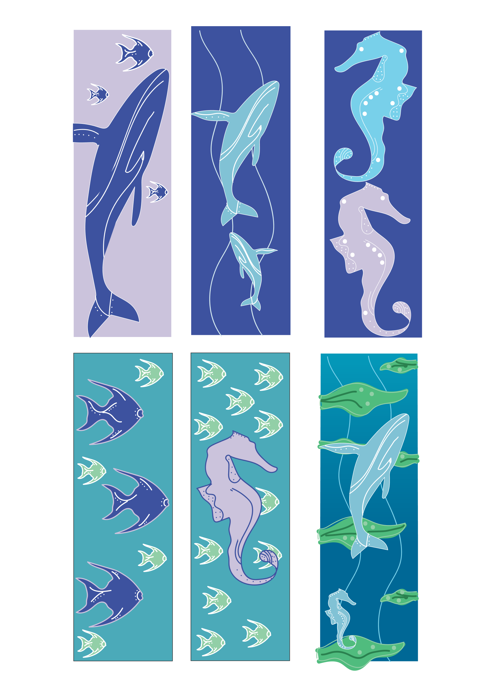 While I stuck with the seahorse, I strayed away from the more detail heavy designs and settled for animals that could be conveyed through more simplistic fine-line illustration. Once I established my main components, I began combining them to create different styles that all follow a system. Evidentally, one of the designs is more experimental with the use of a gradient background, but it still correlates to the other five designs as it possesses the whale illustration that is apparent in some of the other designs.