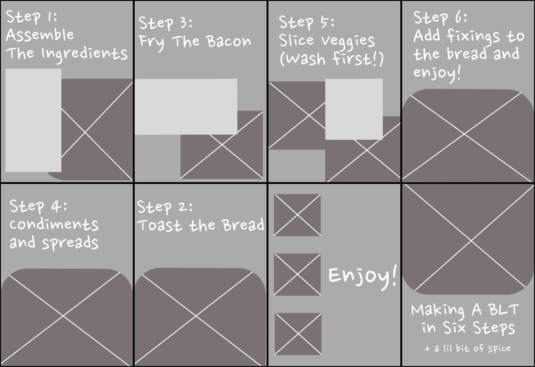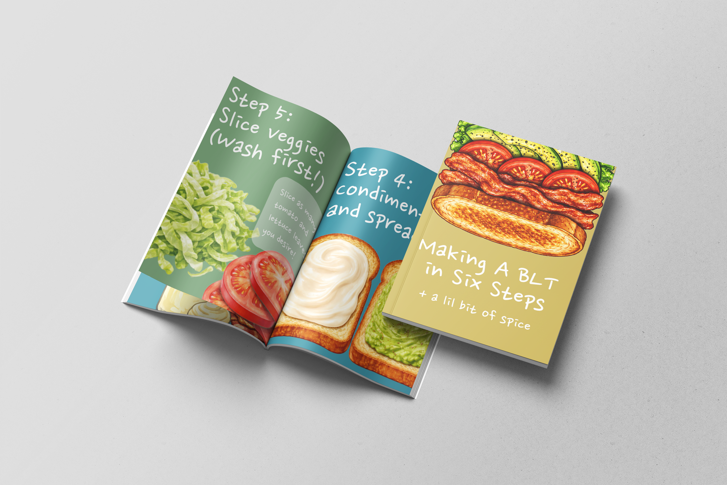 This six-step mini zine uses playful illustration and concise text to guide readers through the process of making a classic BLT. Designed as a small-format booklet, the project focuses on visual storytelling, using bold colors, expressive imagery and simple typography to make each step engaging and easy to follow. The layout emphasizes sequencing, hierarchy, and rhythm, creating a lighthearted yet functional instructional piece.